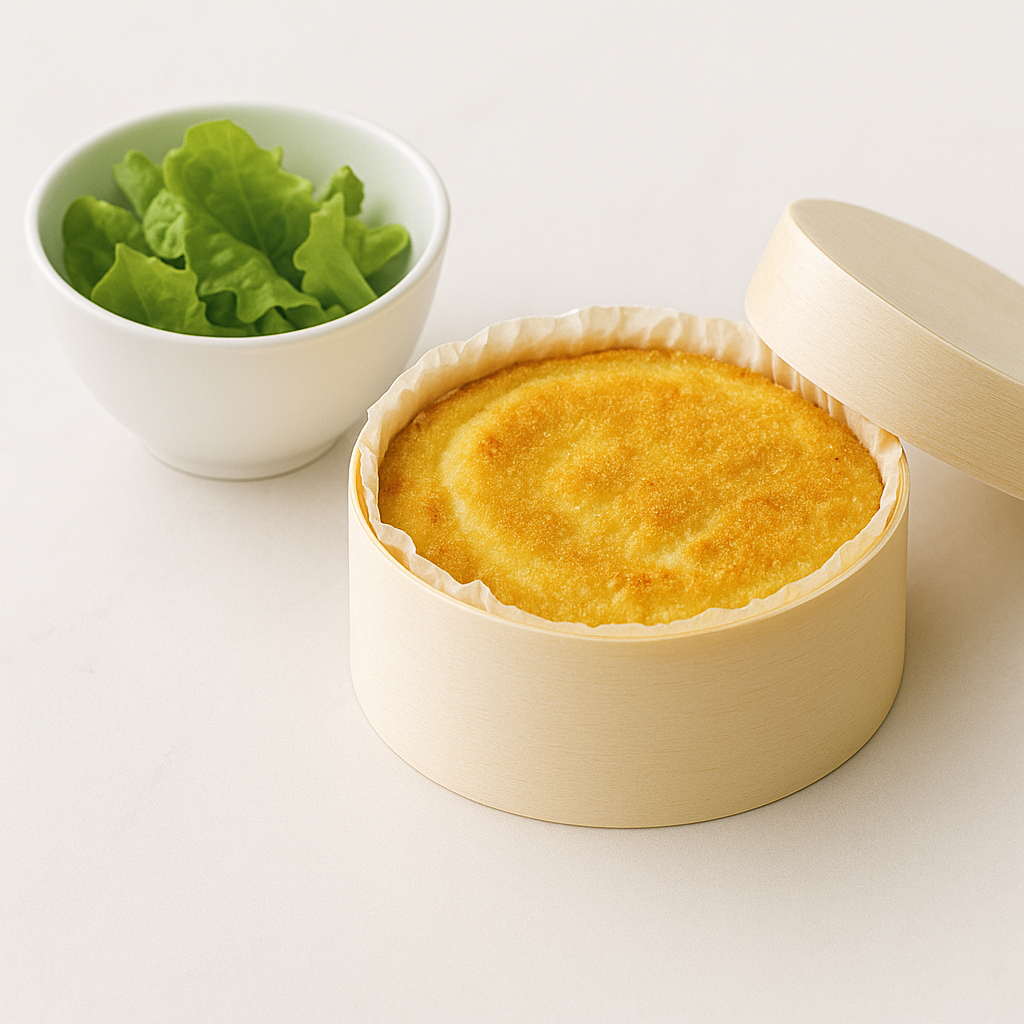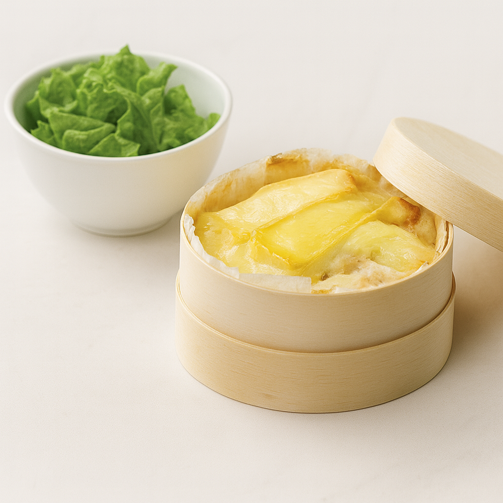 Reblochon de Savoie AOP, pommes de terre et lardons de porc, présenté dans une barquette de bois ronde et accompagné de son mesclun de salade